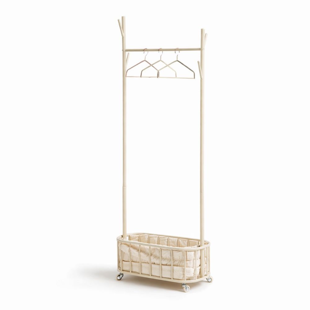 Rollbare Garderobe mit Kleiderstange und Wäschekorb, 4 Haken, Schuhablage und Rollen, 70 x 36 x 147 cm, Weiß